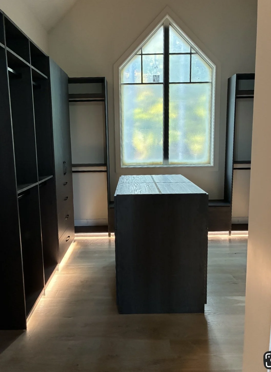 Modern layouts, minimal hardware, and crisp lines played a strong role in many 2025 projects. Storage was often designed to complement architectural features, including unique window shapes, rather than compete with them.